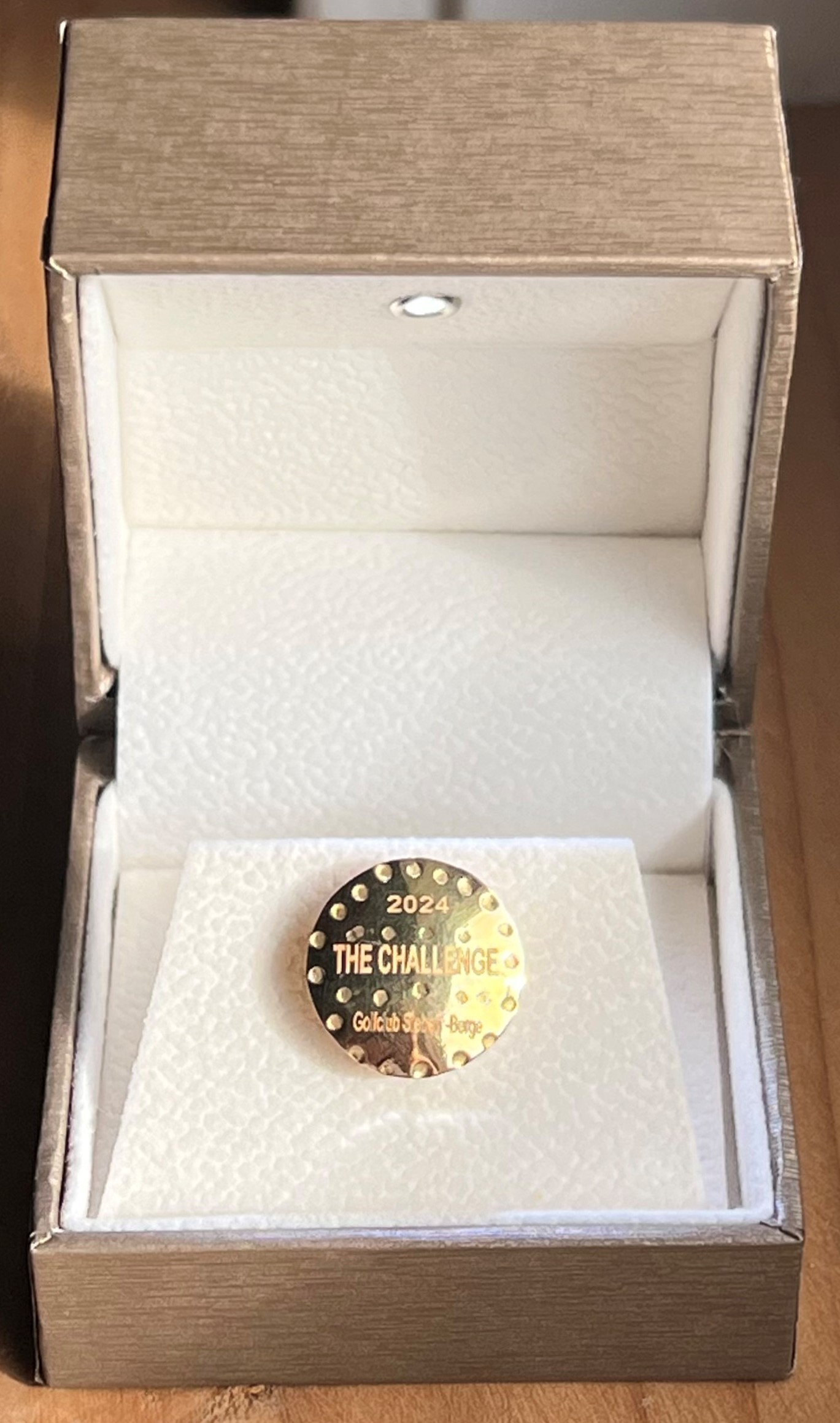 1. Preis: ein goldener handgefertigter Anstecker (17 mm Durchmesser, 750er-Gold) und ein Preisgeld in Höhe von 540 €